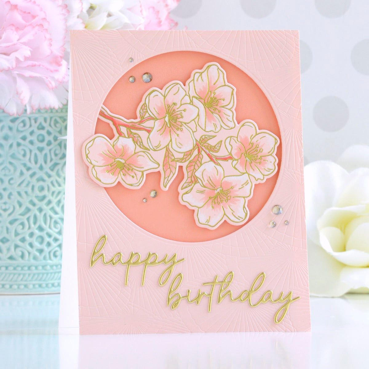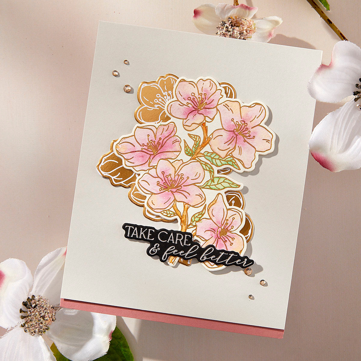 Cherry Blossoms BetterPress Plate & Die Set is from the Spring in Kyoto Collection by Alex Syberia Designs. The two plates impress two cherry blossom clusters in full bloom and a sentiment, Bloom Where You Are. Each has a corresponding die to cut out. Ink the plates with the BetterPress Ink to be pressed against the BetterPress Cotton Card Panel and Sheets for a crisp letterpress design.
