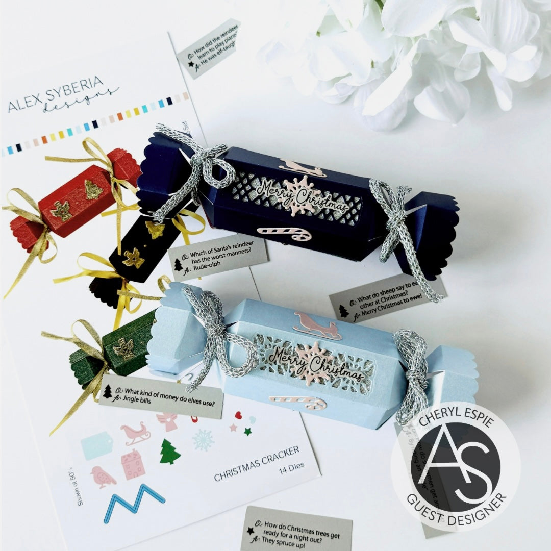 Christmas Cracker Die Set by Alex Syberia Designs lets you create your own traditional six-sided festive crackers at home. A Christmas cracker is a classic holiday treat, traditionally filled with small surprises to bring joy to celebrations. Pair this die set with the Christmas Jokes Stamp Set (sold separately) to add a playful surprise inside each cracker – just like the traditional ones on your holiday table!
