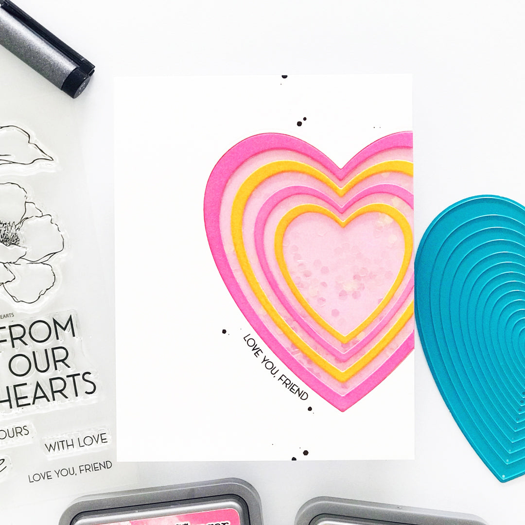 This versatile die cuts 15 perfectly nested hearts in one pass, ranging from approximately 3.9" x 4.0" for the largest heart to 0.14" x 0.15" for the smallest.