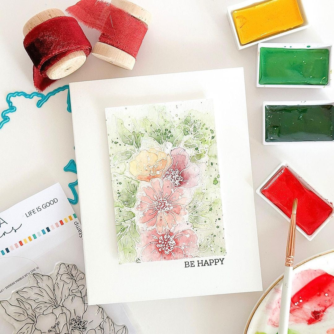 We have the Life is Good Layering Stencil with which you will quickly add lots of colour and dimension to this bouquet!